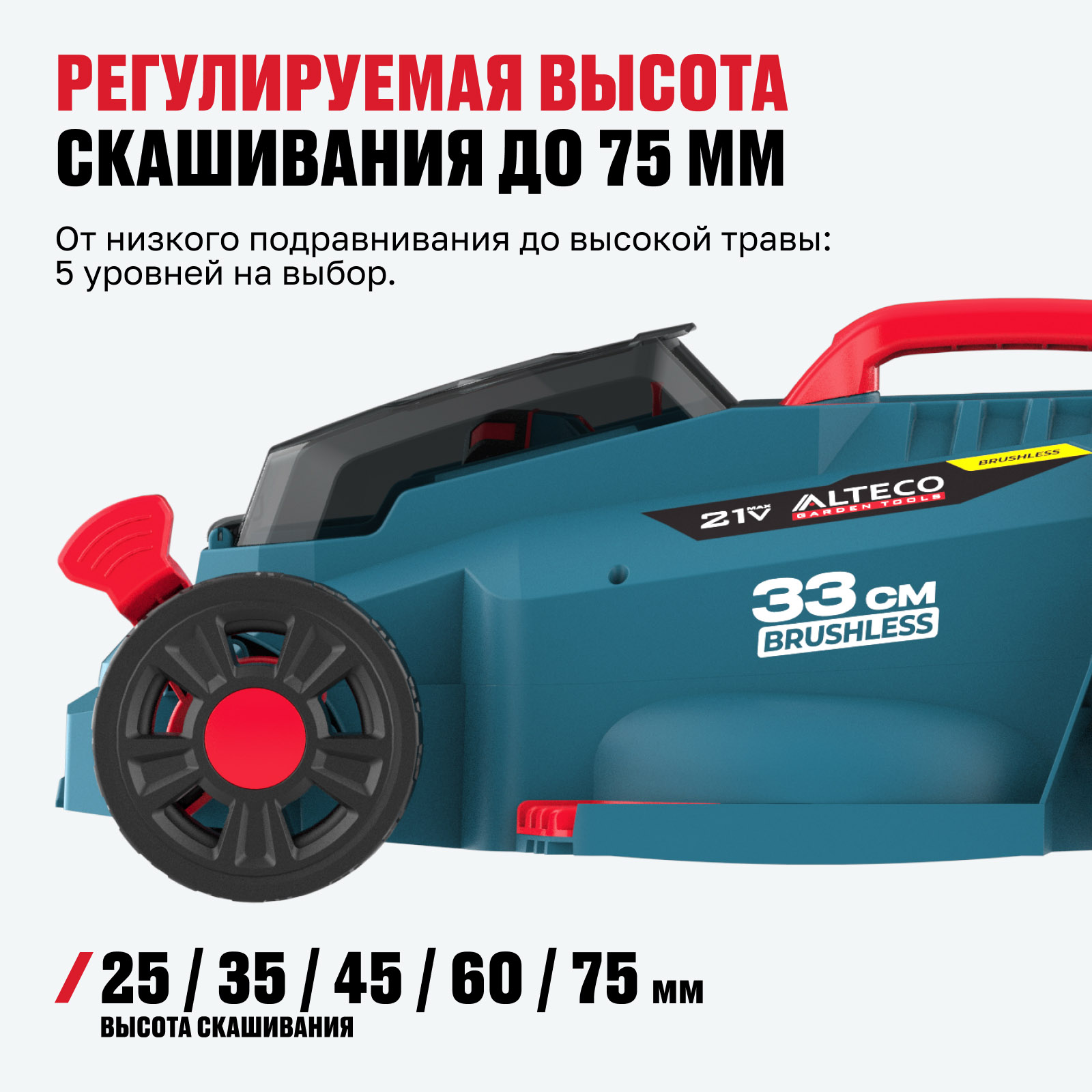 - Регулируемая высота скашивания до 75 мм — от низкого подравнивания до высокой травы: 5 уровней на выбор.