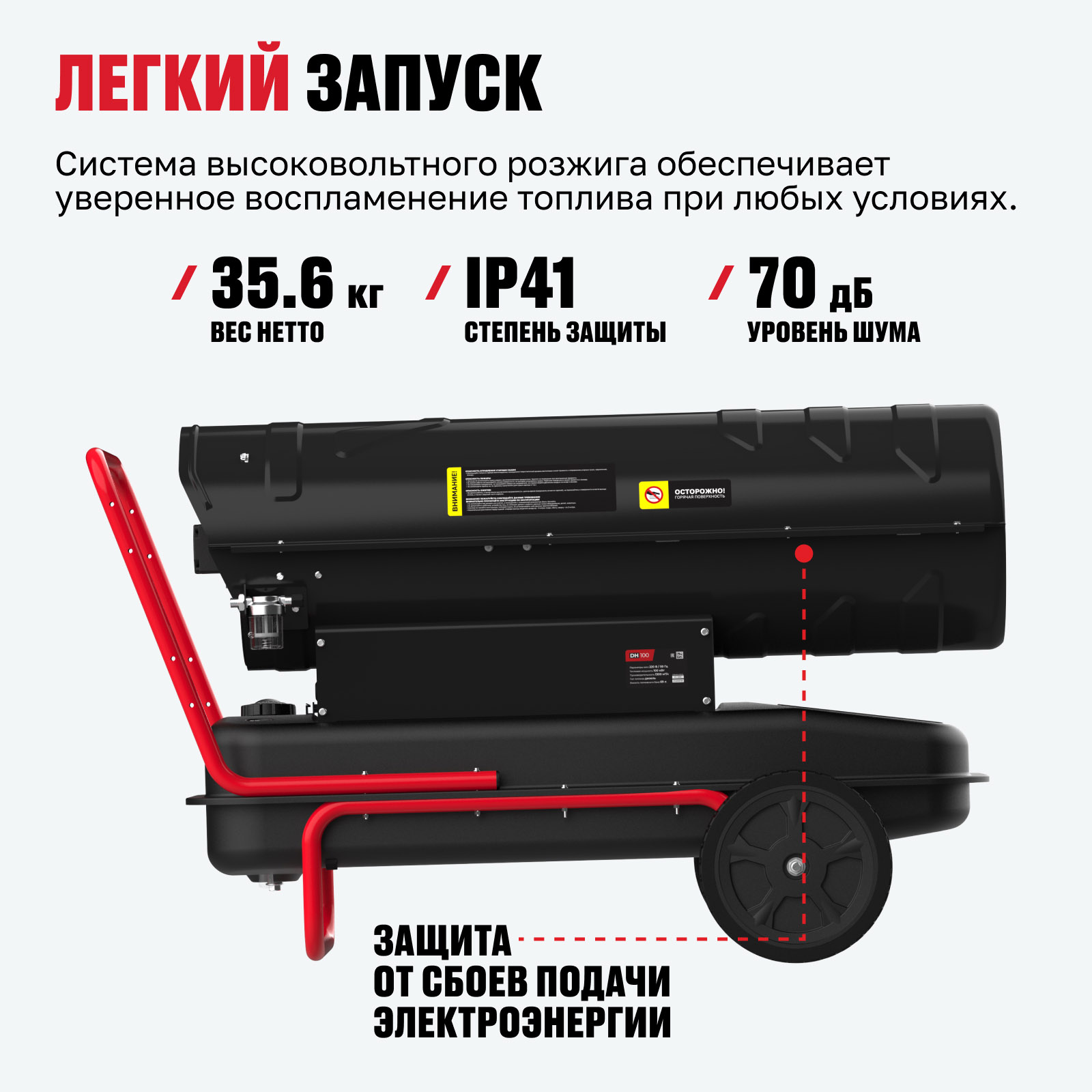 - Большой топливный бак 69 л — обеспечивает длительную автономную работу без дозаправки, позволяя устройству работать непрерывно до 7 часов.