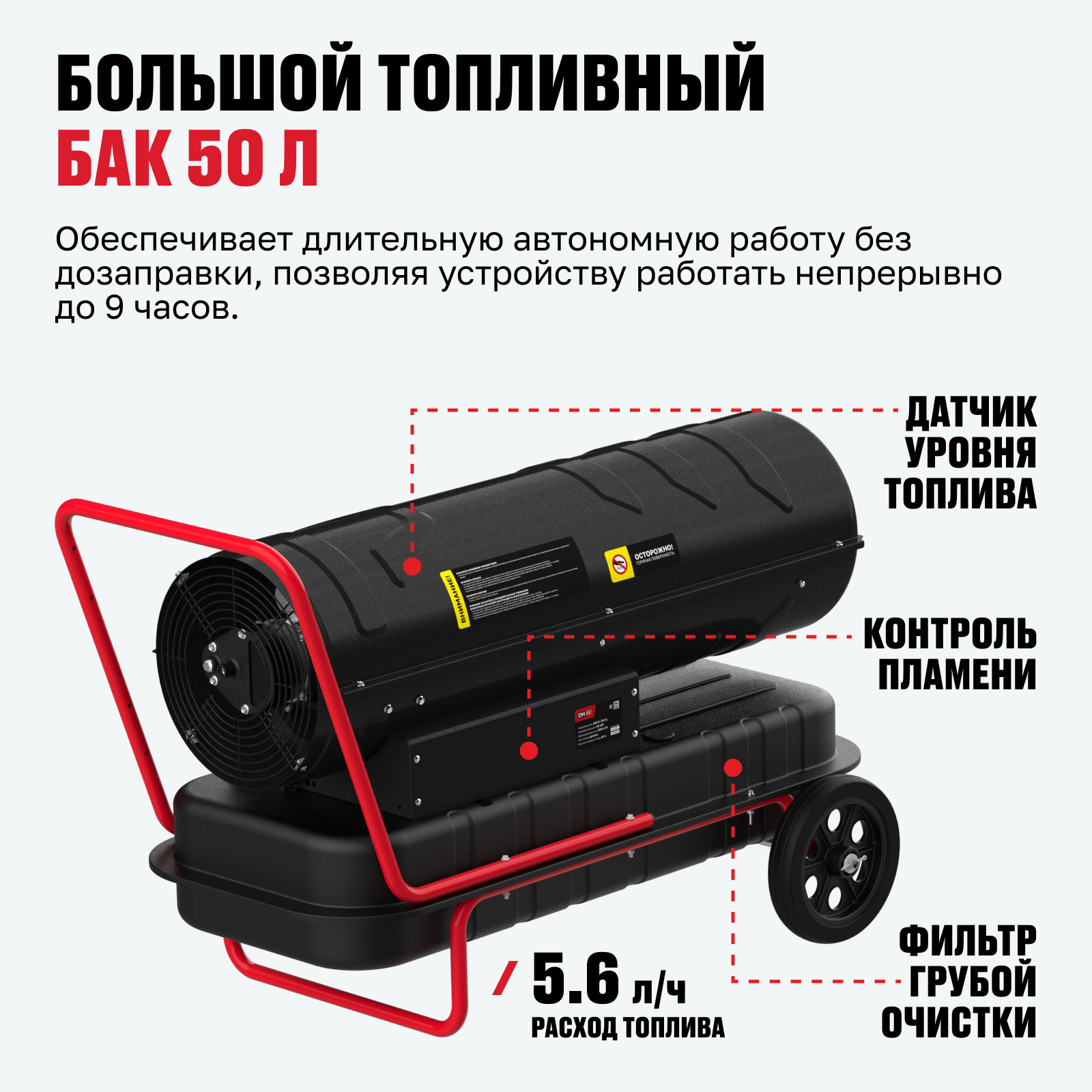 - Большой топливный бак 50 л — обеспечивает длительную автономную работу без дозаправки, позволяя устройству работать непрерывно до 9 часов.