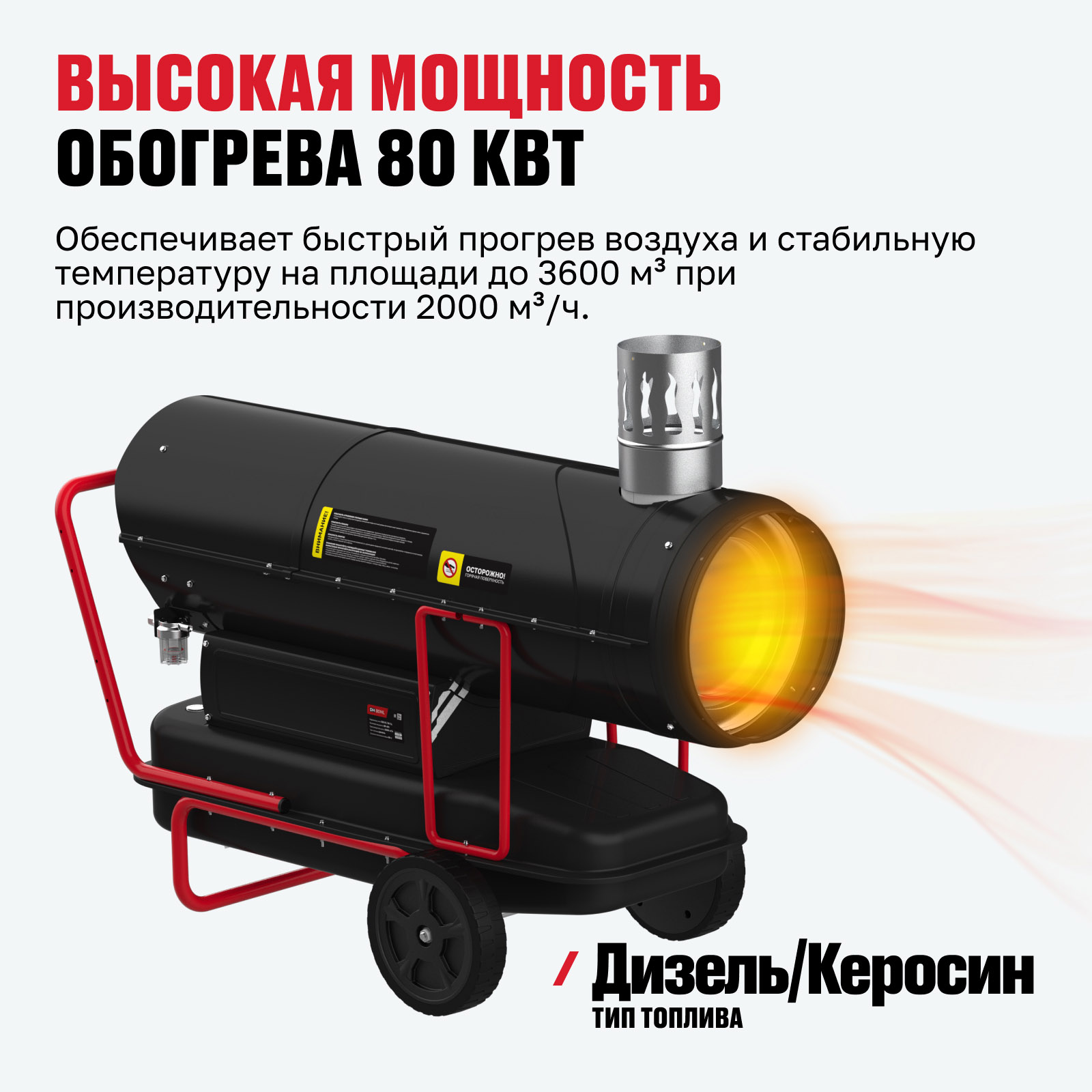 - Высокая мощность обогрева 80 кВт — обеспечивает быстрый прогрев воздуха и стабильную температуру на площади до 3600 м³ при производительности 2000 м³/ч.