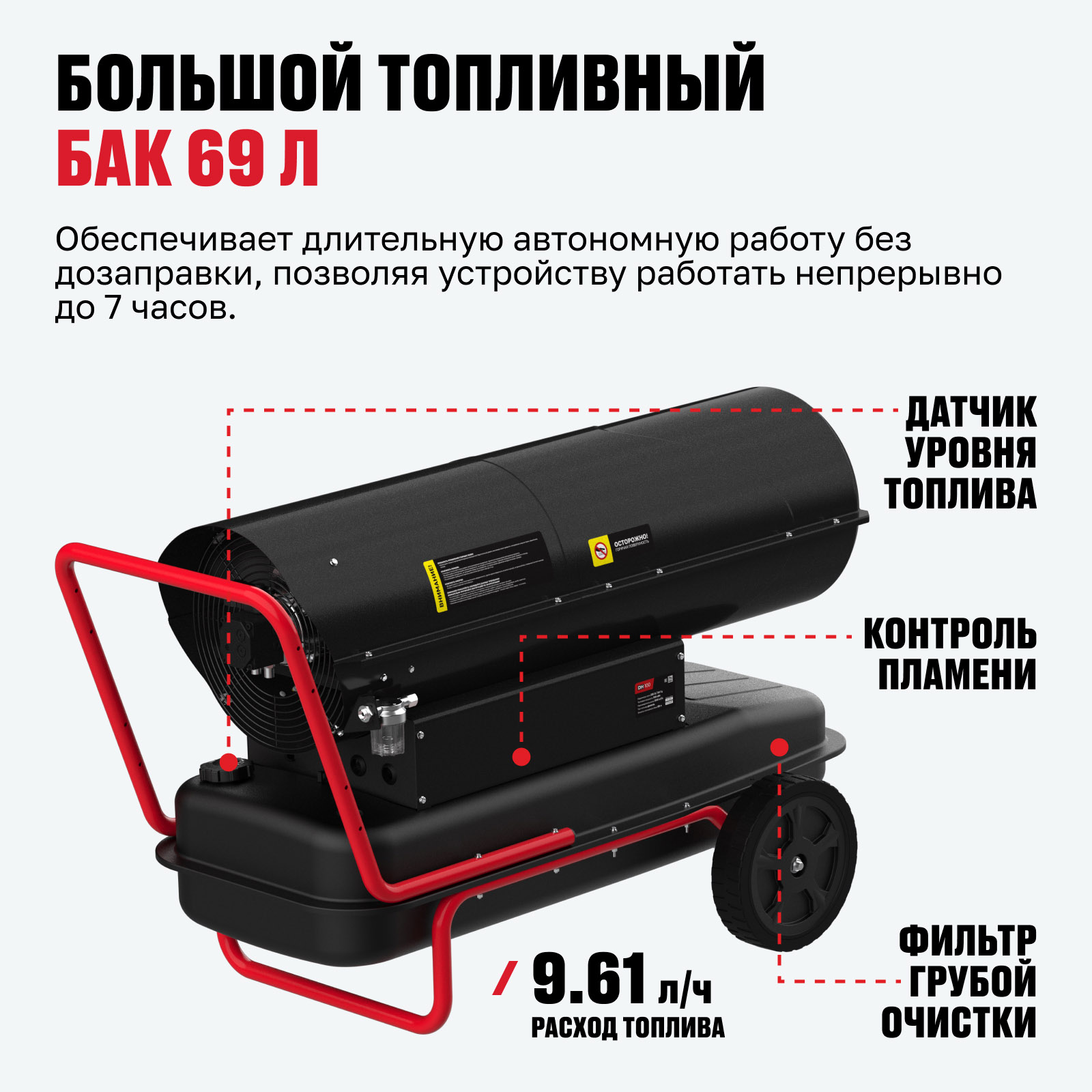 - Большой топливный бак 69 л — обеспечивает длительную автономную работу без дозаправки, позволяя устройству работать непрерывно до 7 часов.