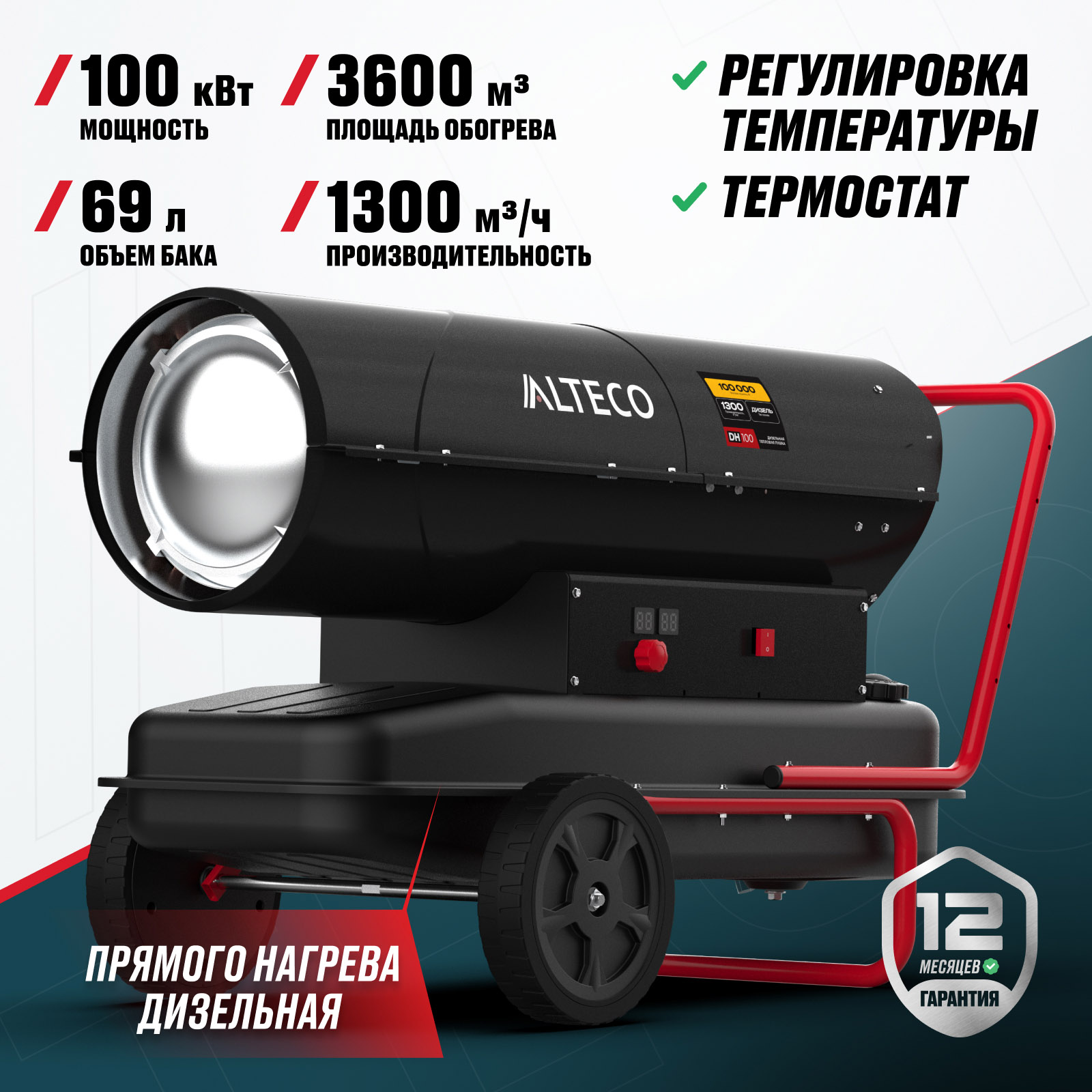 - Высокая мощность обогрева 100 кВт — обеспечивает быстрый прогрев воздуха и стабильную температуру на площади до 3600 м³ при производительности 1300 м³/ч.