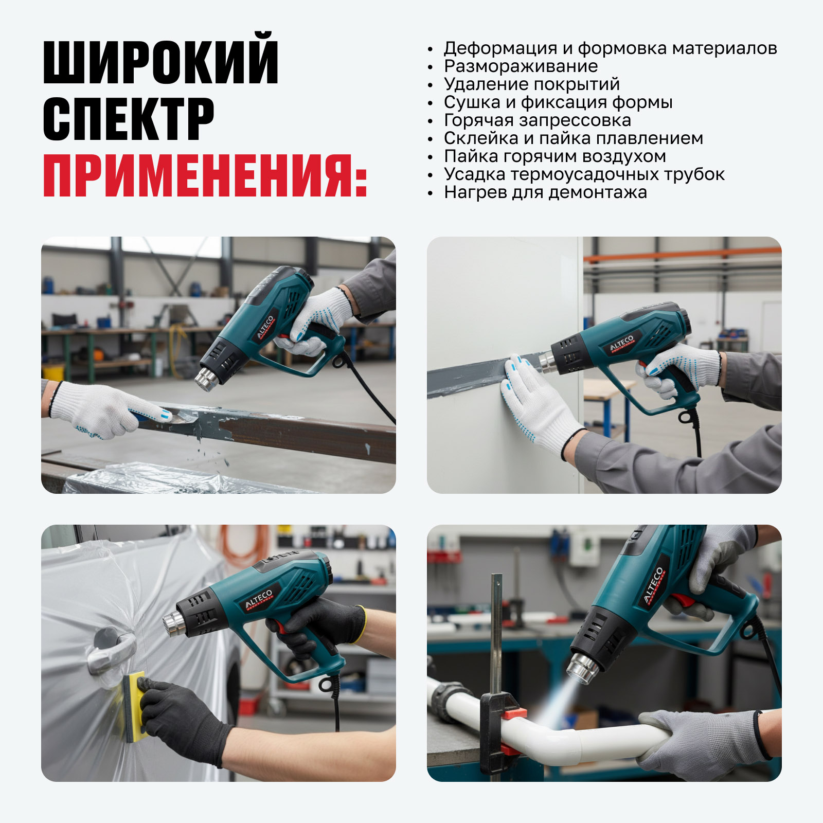 - Деформация и формовка материалов — нагрев для изгиба и придания формы пластику и ПВХ.