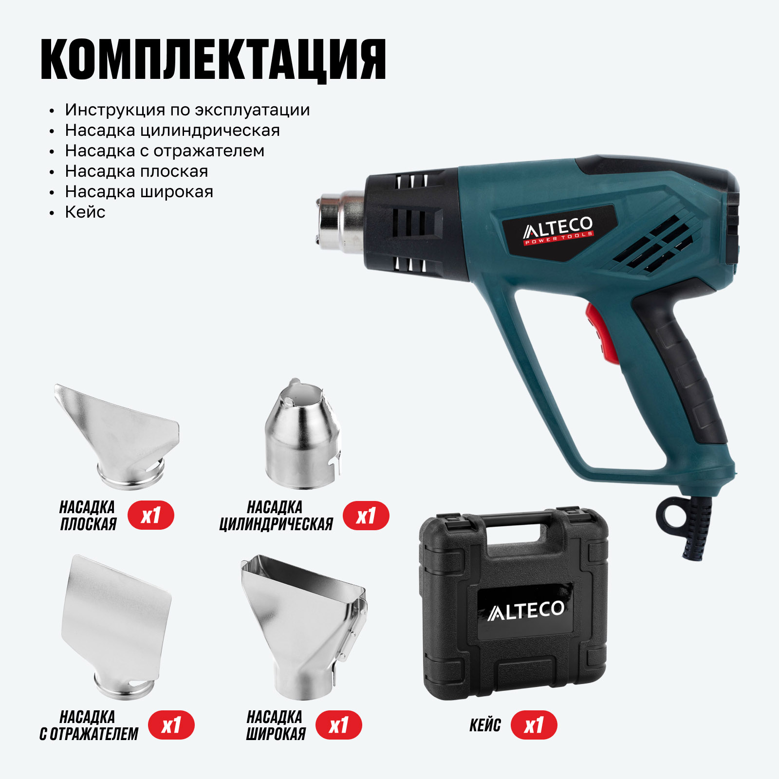 - Набор из 4 насадок — расширяет возможности применения: от точечного прогрева до распределенного потока.