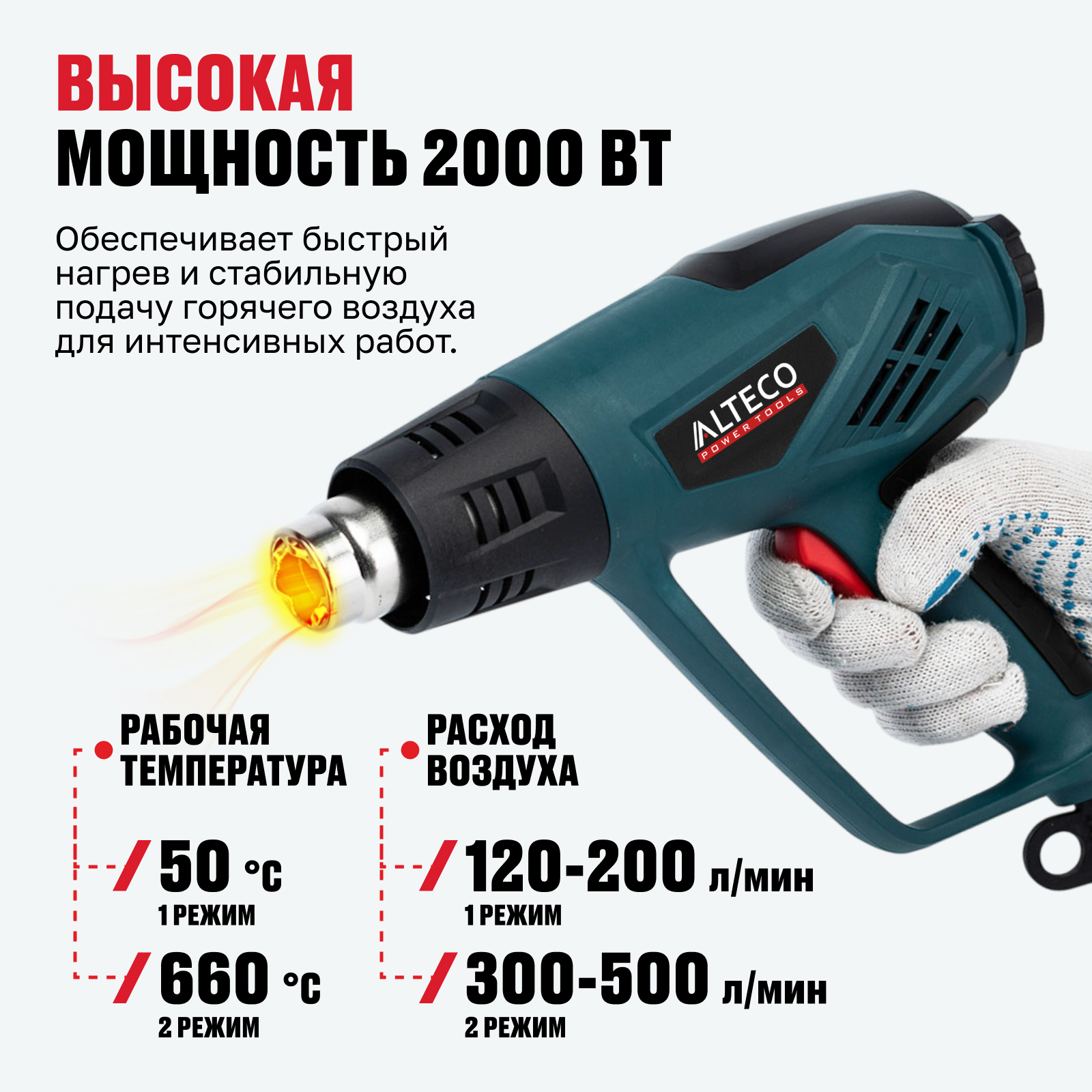 - Высокая мощность 2000 Вт — обеспечивает быстрый нагрев и стабильную подачу горячего воздуха для интенсивных работ.