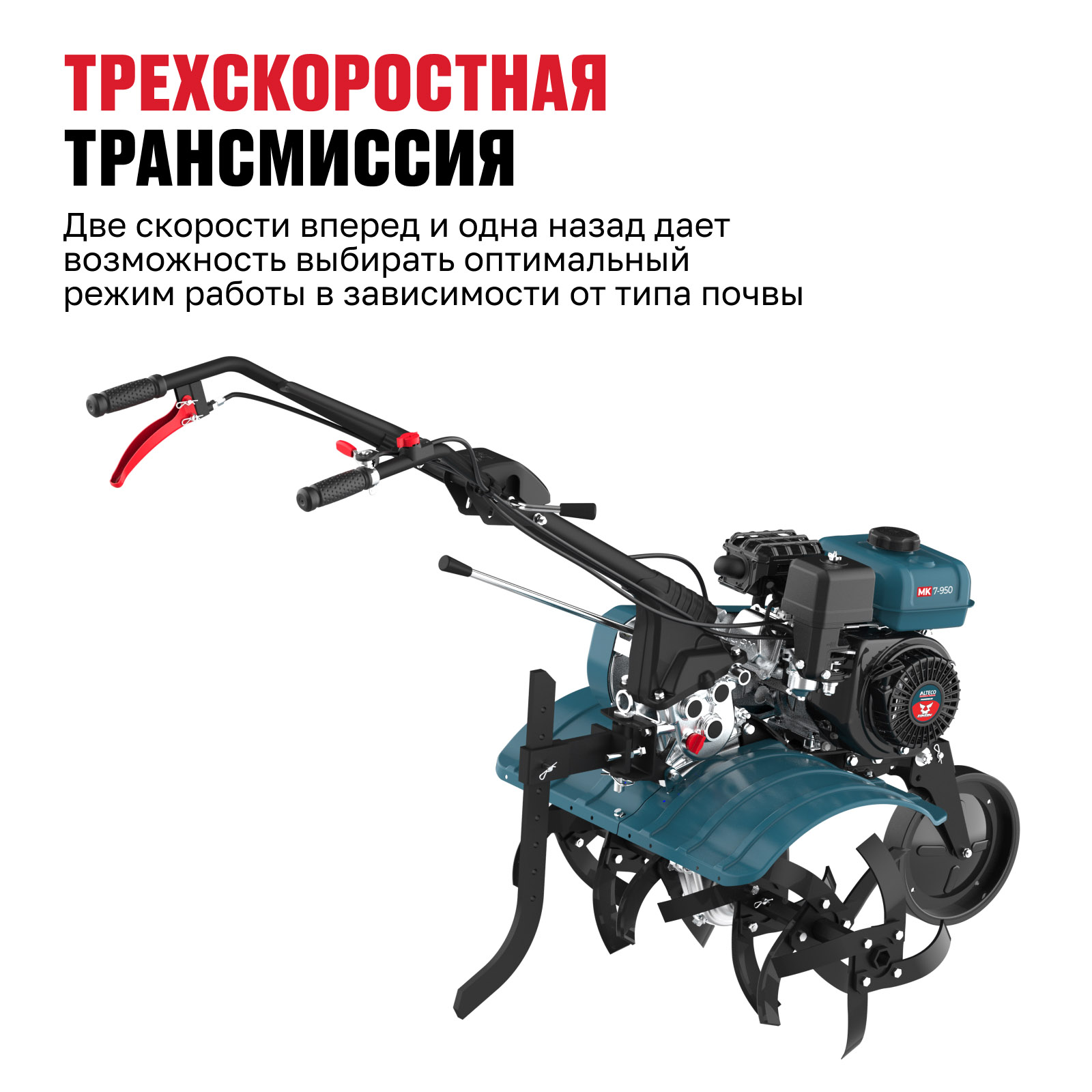 - Трехскоростная трансмиссия (две скорости вперед и одна назад) дает возможность выбирать оптимальный режим работы в зависимости от типа почвы.