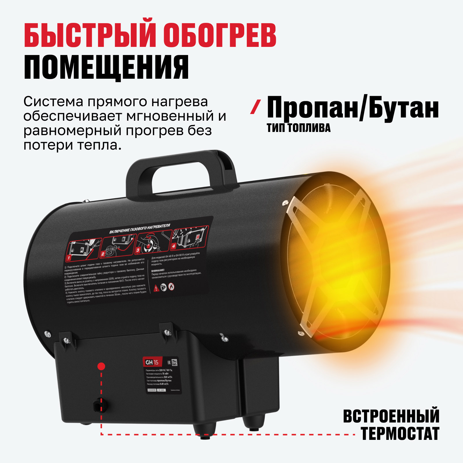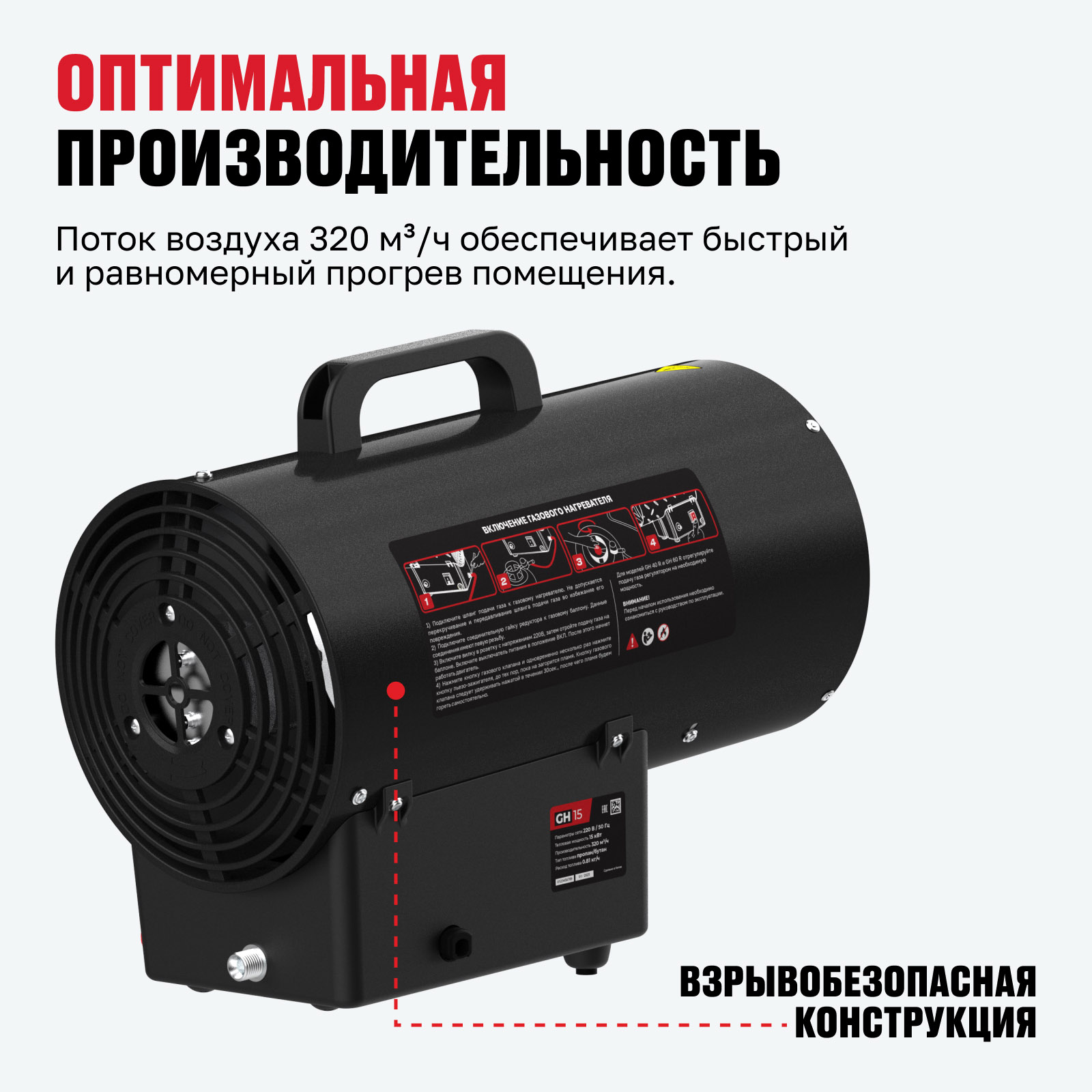 - Оптимальная производительность — поток воздуха 320 м³/ч обеспечивает быстрый и равномерный прогрев помещения.