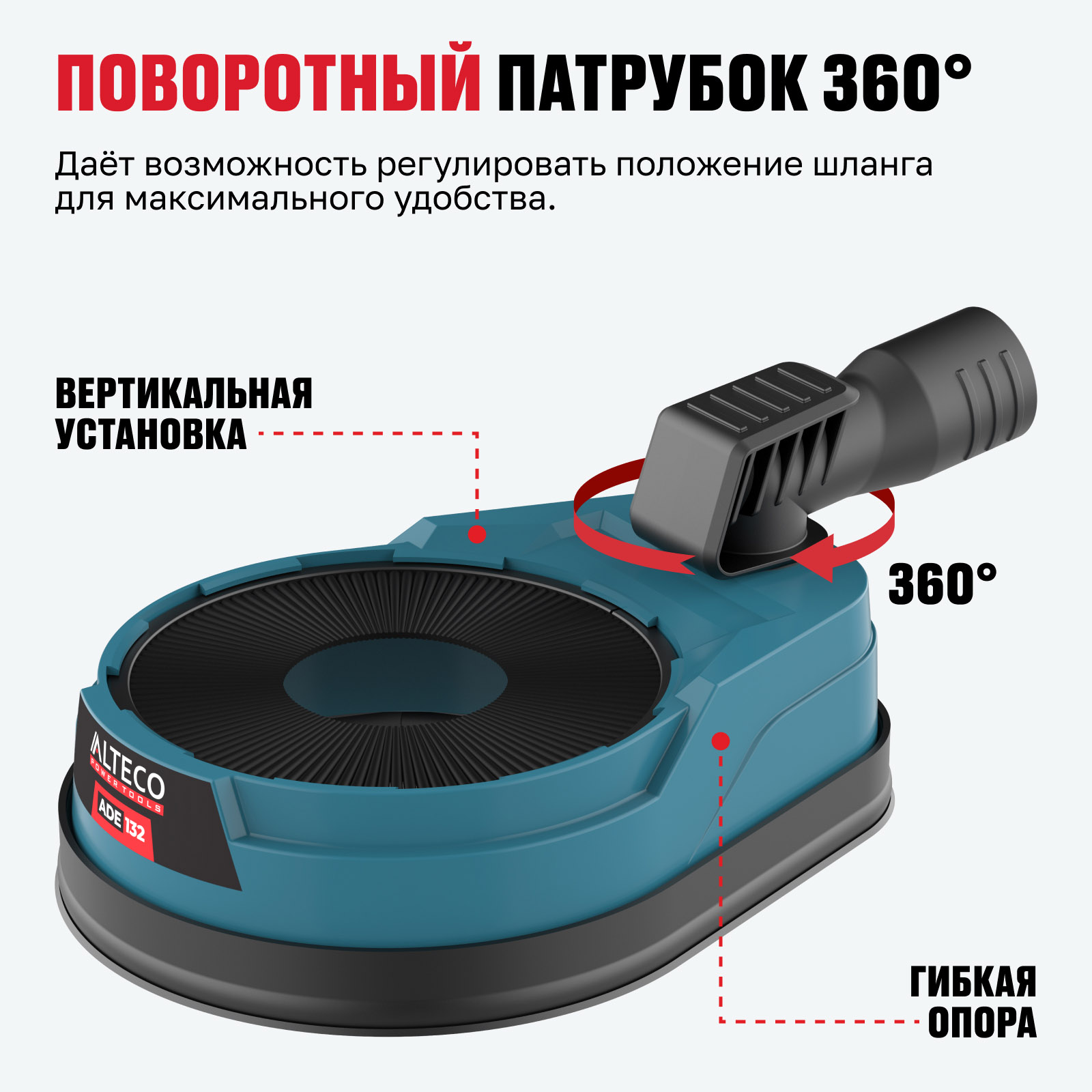 - Поворотный патрубок 360° — даёт возможность регулировать положение шланга для максимального удобства.