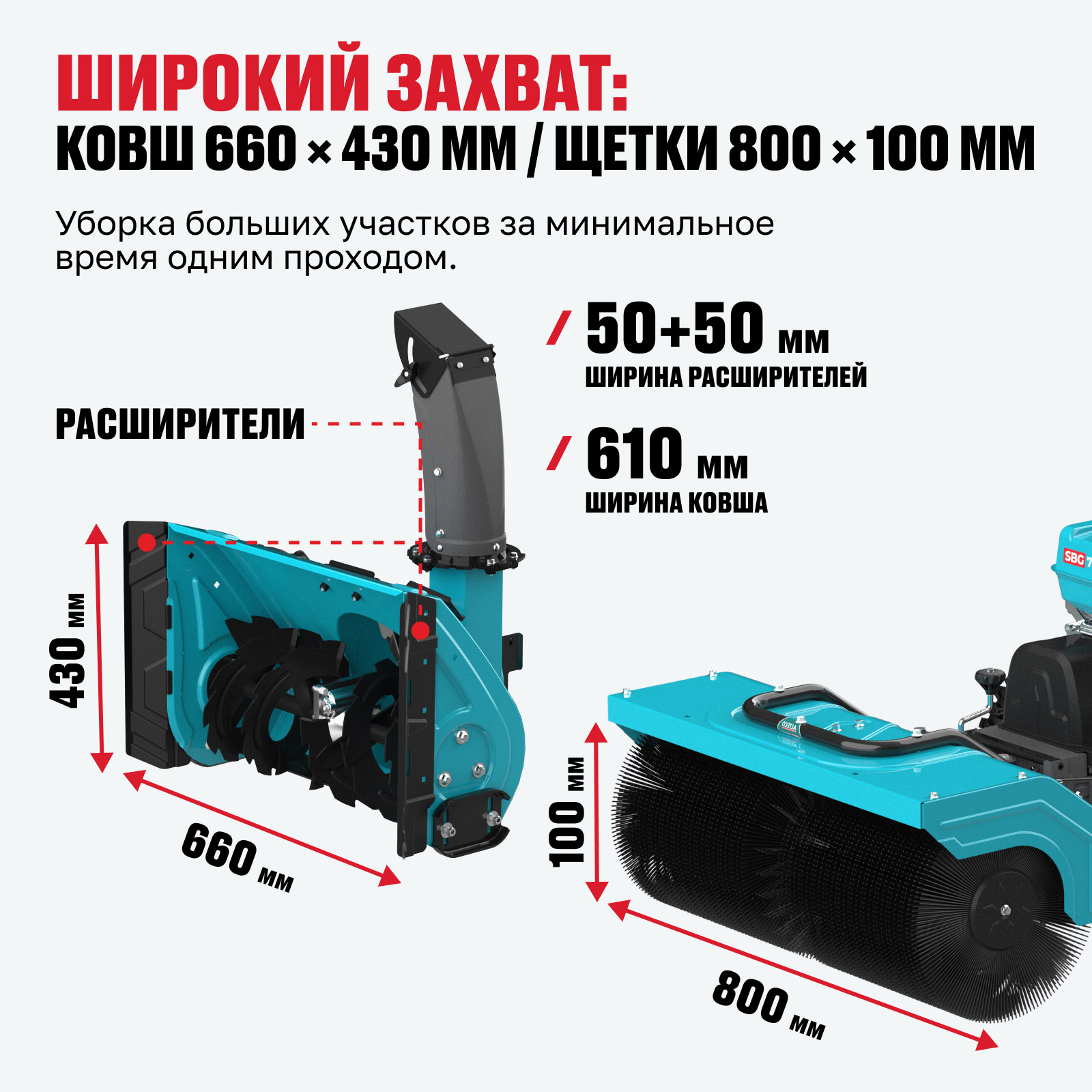 - Широкий захват: ковш 660 × 430 мм / щетки 800 × 100 мм — уборка больших участков за минимальное время одним проходом.
