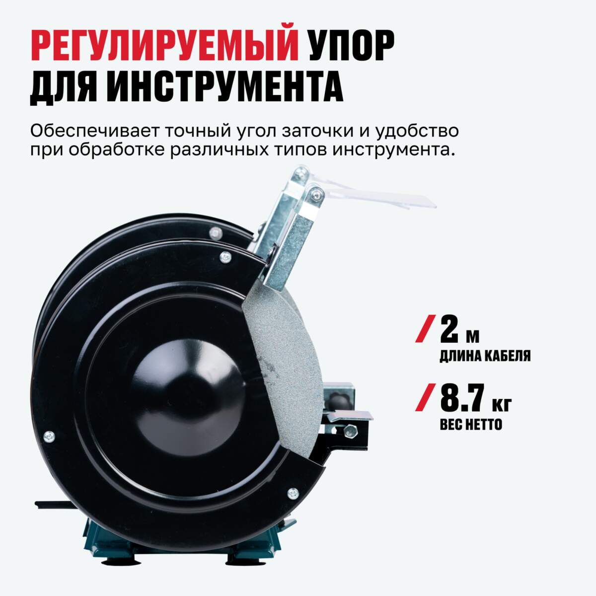 - Регулируемый упор для инструмента — обеспечивает точный угол заточки и удобство при обработке различных типов инструмента.