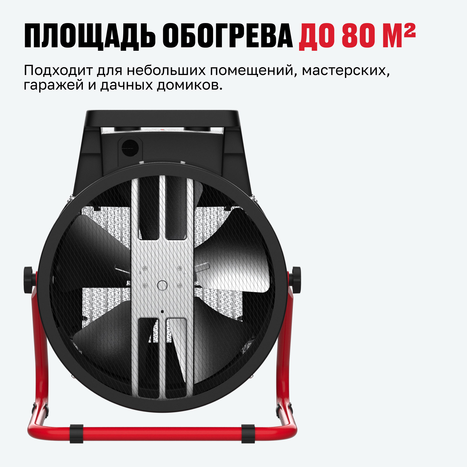 - Площадь обогрева до 80 м² — подходит для небольших помещений, мастерских, гаражей и дачных домиков.
